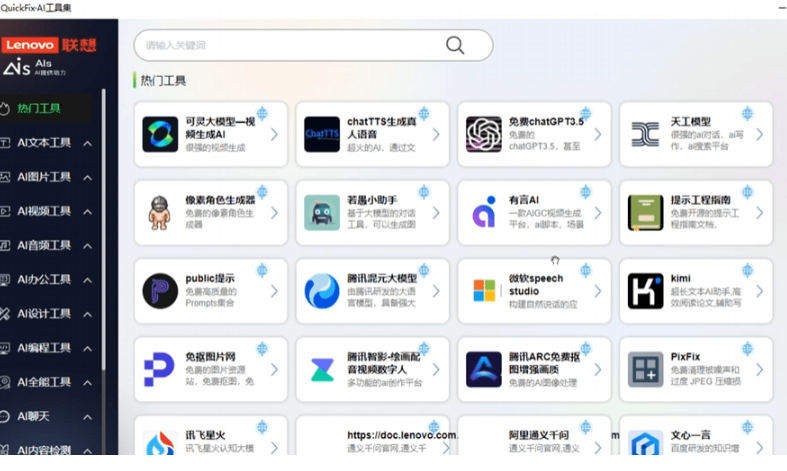 Lenovo QuickFix集合100+实用工具,覆盖AI图片、AI音频、AI办公、AI设计以及系统优化、维护等工具,提升办公效率,快捷解决电脑问题,本次为大家带来了该款绿色纯净的强大工具。。