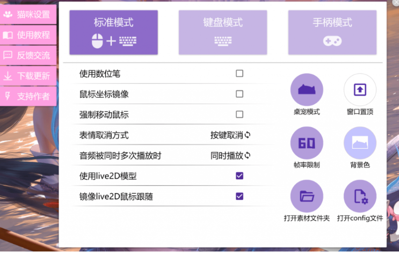 Bongo Cat Mver是一款用于装饰直播/视频/桌面的工具,它能根据鼠标、键盘、手柄操作做出相应的动作,它具有高度的可定制性,带上只属于你自己的超萌cat玩电脑吧!工具完全免费,而且给大家提供了12款皮肤。这是由一位国外高中生 Kuroni 开发的程序,可以让桌面宠物跟随鼠标和键盘的动作。这只小猫会模仿你的各种鼠标和键盘操作,你移动鼠标,它也会移动鼠标,你点击右键,它也会点击右键,你敲击哪个字母,它也会敲击哪个字母。