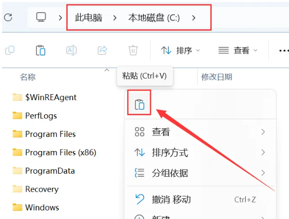 4.打开电脑C盘,鼠标右击空白处选择【粘贴】。