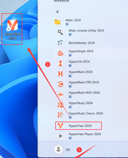 24.创建桌面快捷方式:①点击桌面任务栏中的【开始图标】>点击【所有应用】>双击展开【Altair 2024】文件夹②将【HyperView 2024】图标拖到电脑桌面。