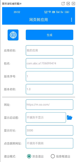 点击生成按钮即可一键将网址转换成APP应用,可自定义填写相应参数,如:应用图标、应用名称、要生成的网址、启动图等等。